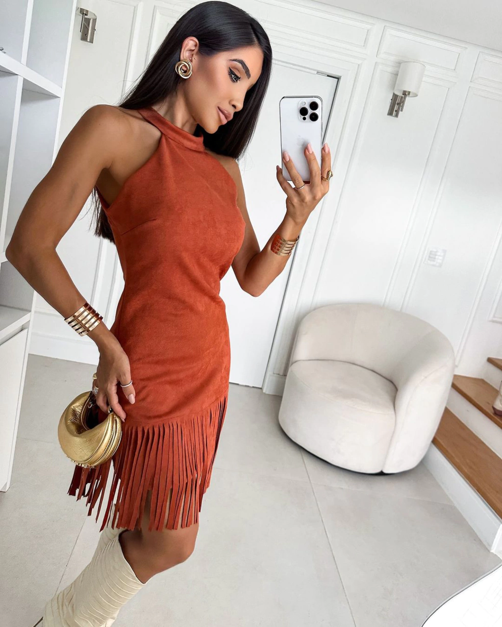 O vestido Paloma é sinônimo de charme e atitude. Com modelagem ajustada e gola alta, ele tem recortes estratégicos nas laterais que valorizam o colo de forma elegante e atual. O detalhe em franjas na barra dá movimento e estilo à peça, adicionando um toque western moderno ao visual. O tom marsala reforça a sofisticação do look, perfeito para quem ama peças que equilibram sensualidade e personalidade.